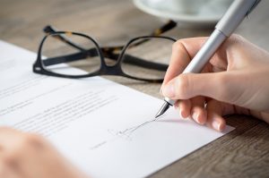 Closeup shot of a woman signing a form. She’s writing on a finan